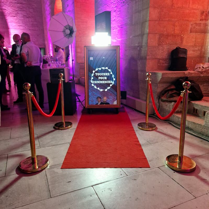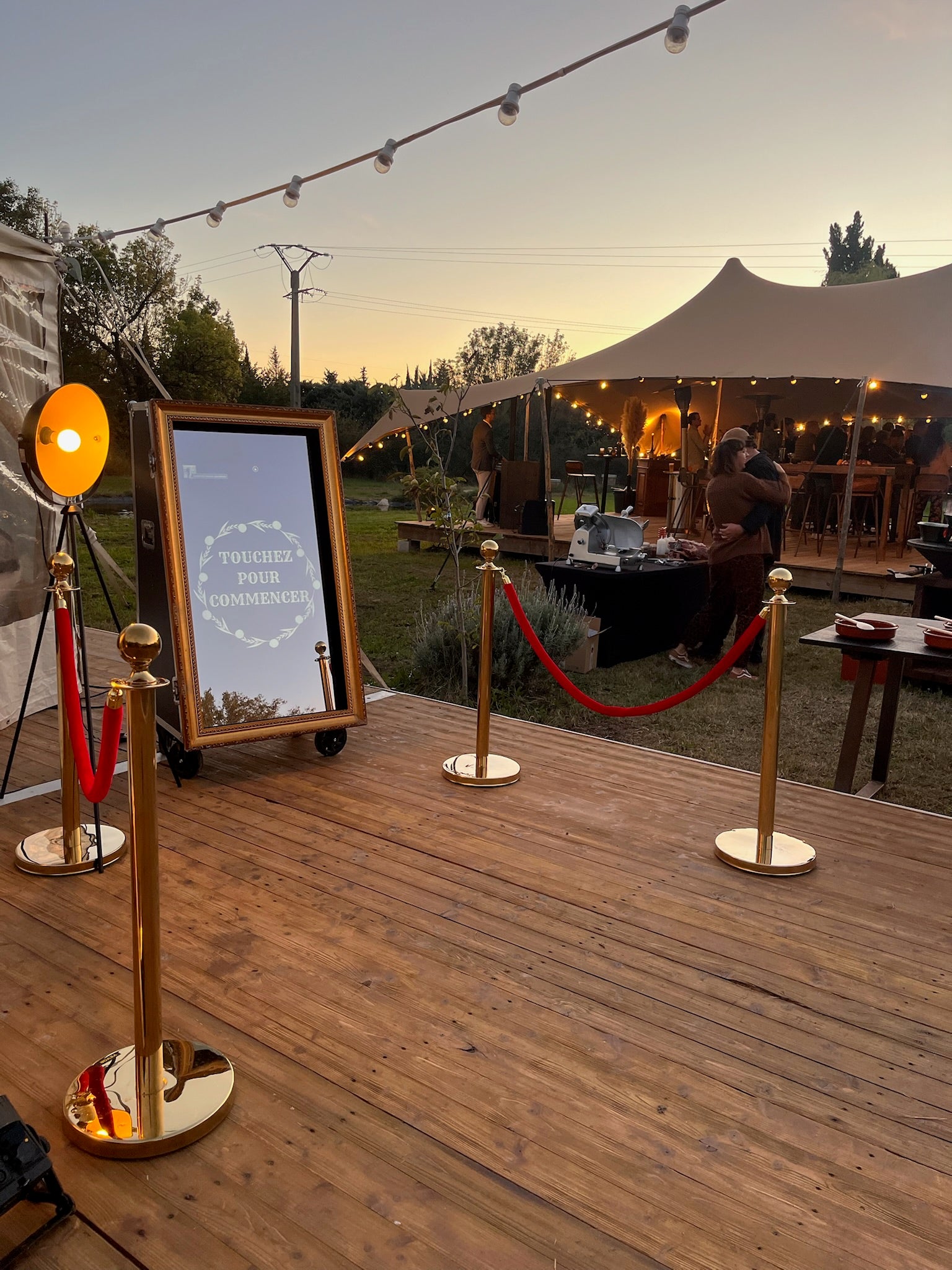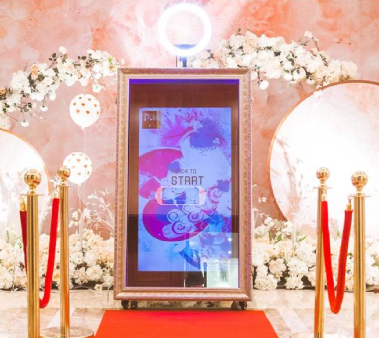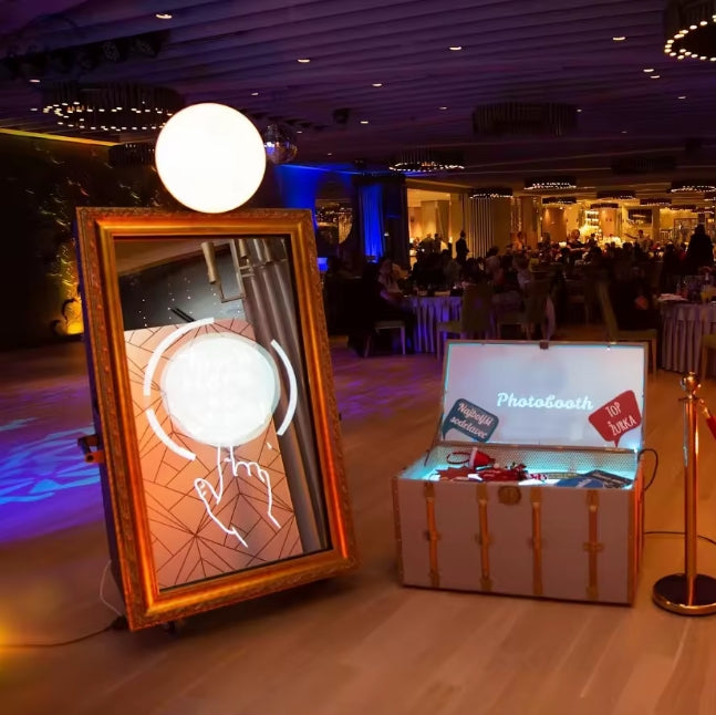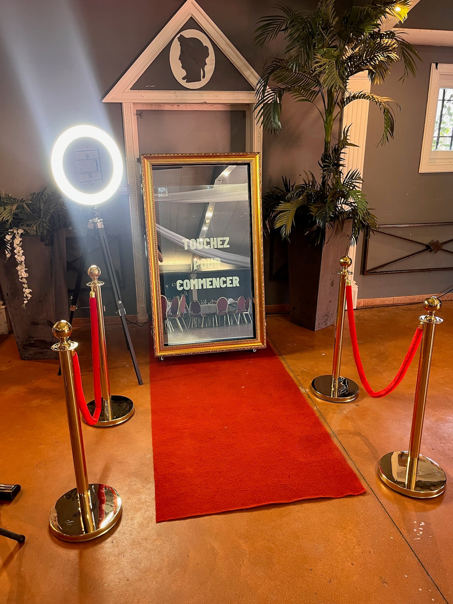 Photobooth Magic Mirror grand format avec écran tactile. Design miroir élégant avec animations interactives et effets visuels personnalisables.