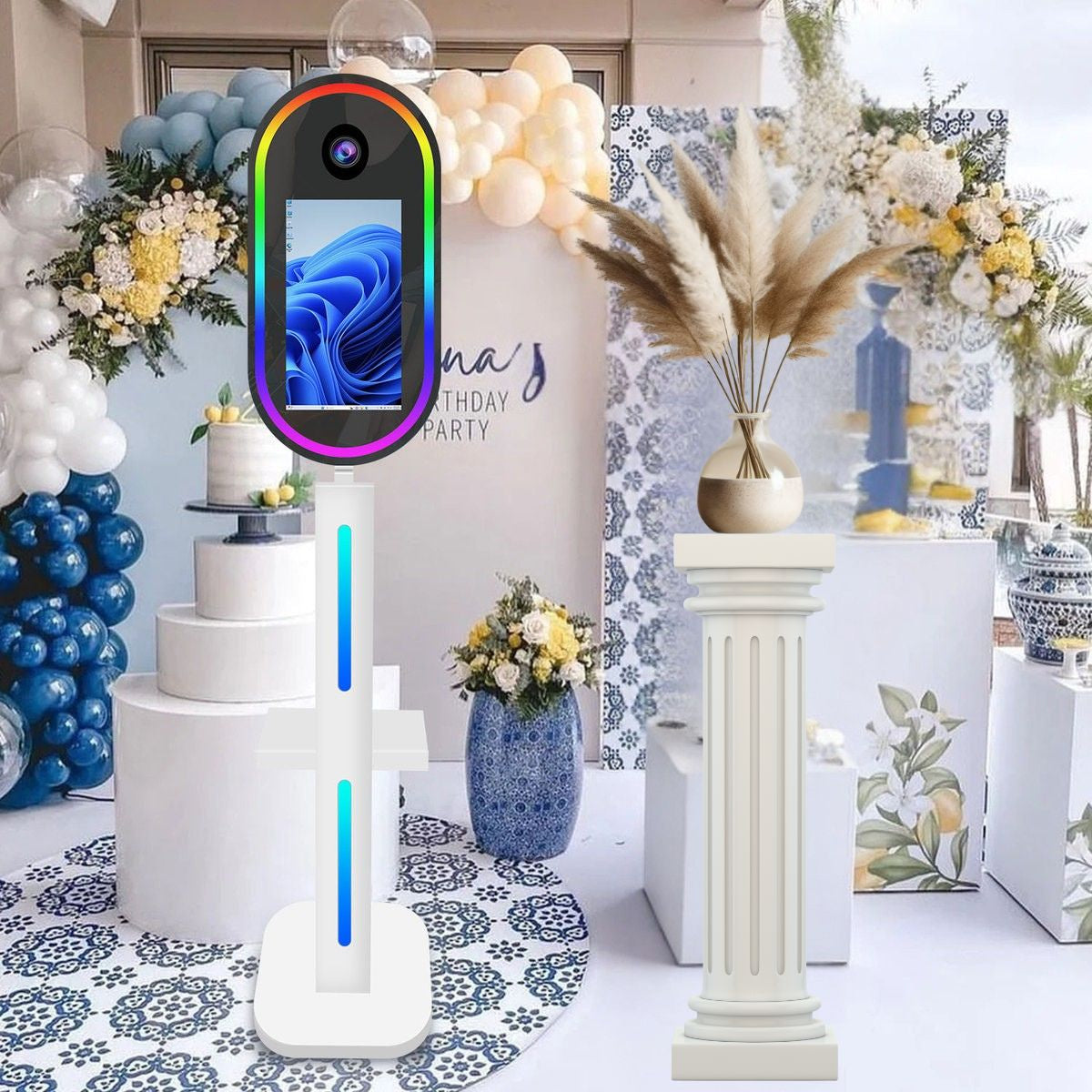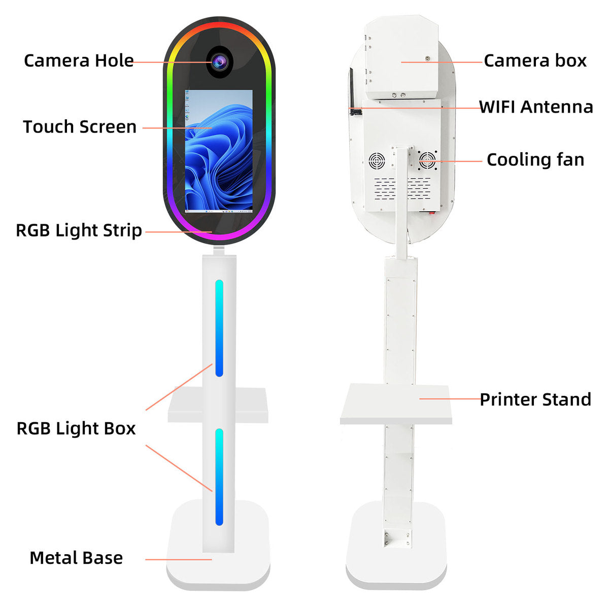 Photobooth miroir au design ovale unique avec éclairage LED RGB intégré. Écran tactile 15.6" Full HD, compatible DSLR. Idéal pour mariages et événements professionnels.