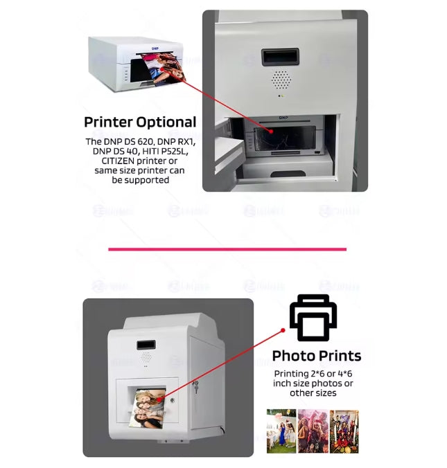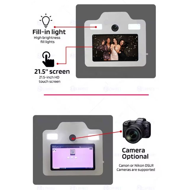 Station photo professionnelle avec écran tactile 21.5 pouces, parfaite pour les événements et animations. Design compact et portable avec flight case inclus.