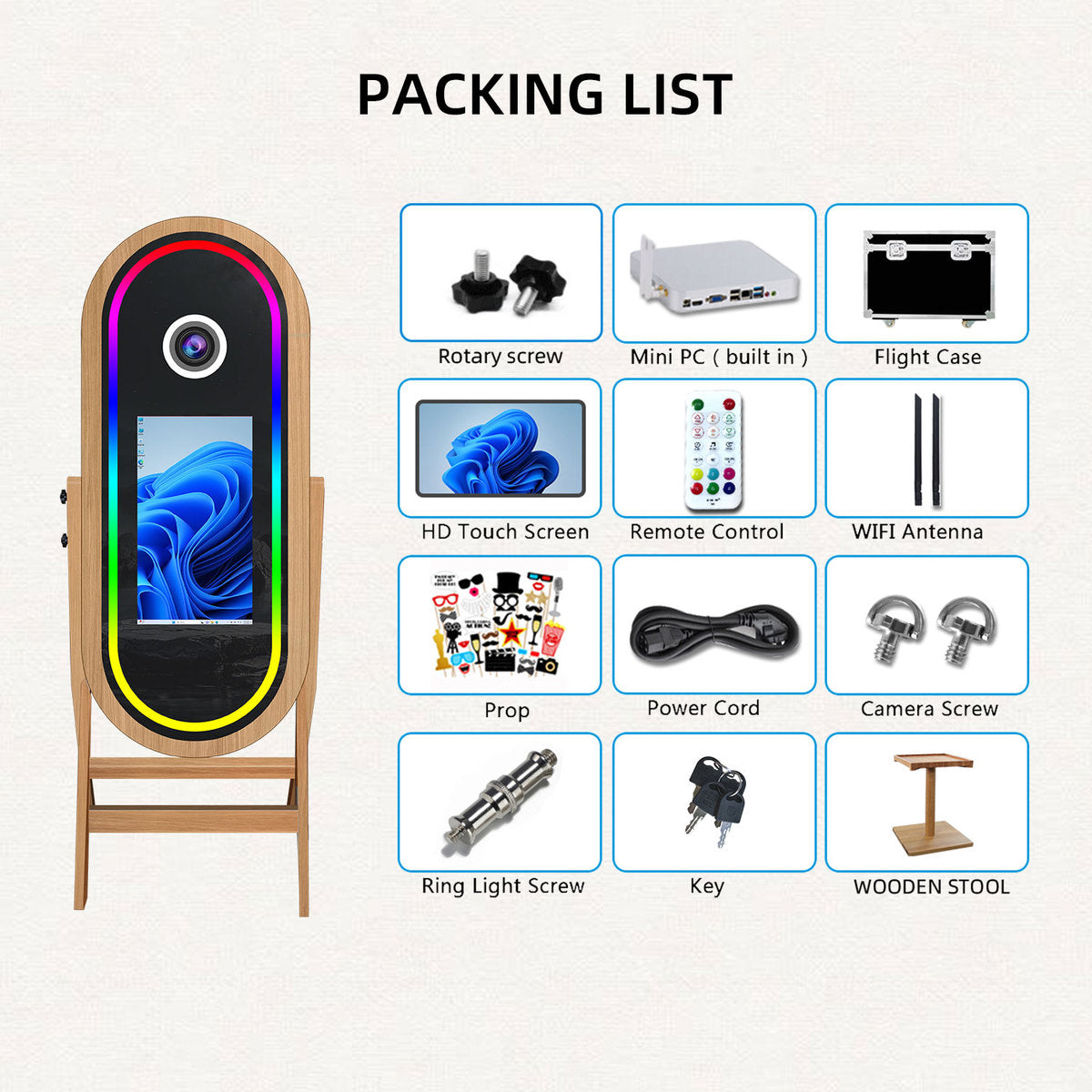 Photobooth vintage en bois avec écran miroir tactile 21,5 pouces. Design rétro élégant alliant modernité et tradition pour des événements mémorables.